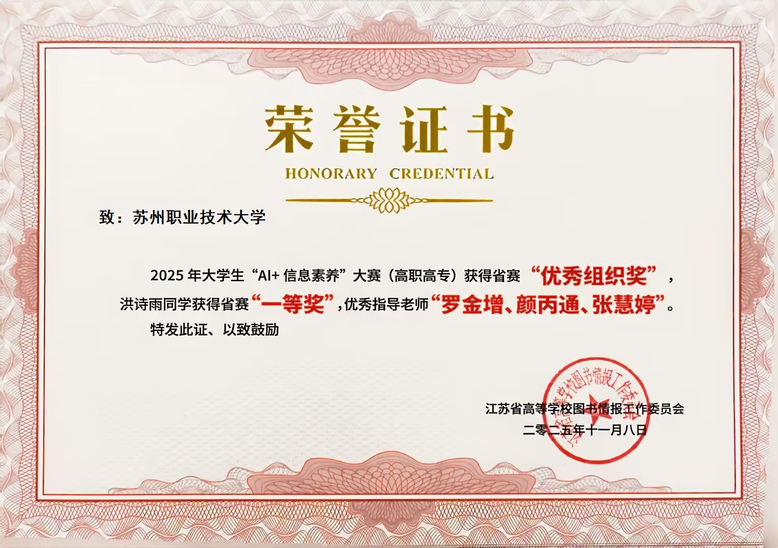 我校学子在2025年大学生“AI+信息素养”大赛(高职高专)江苏赛区一等奖