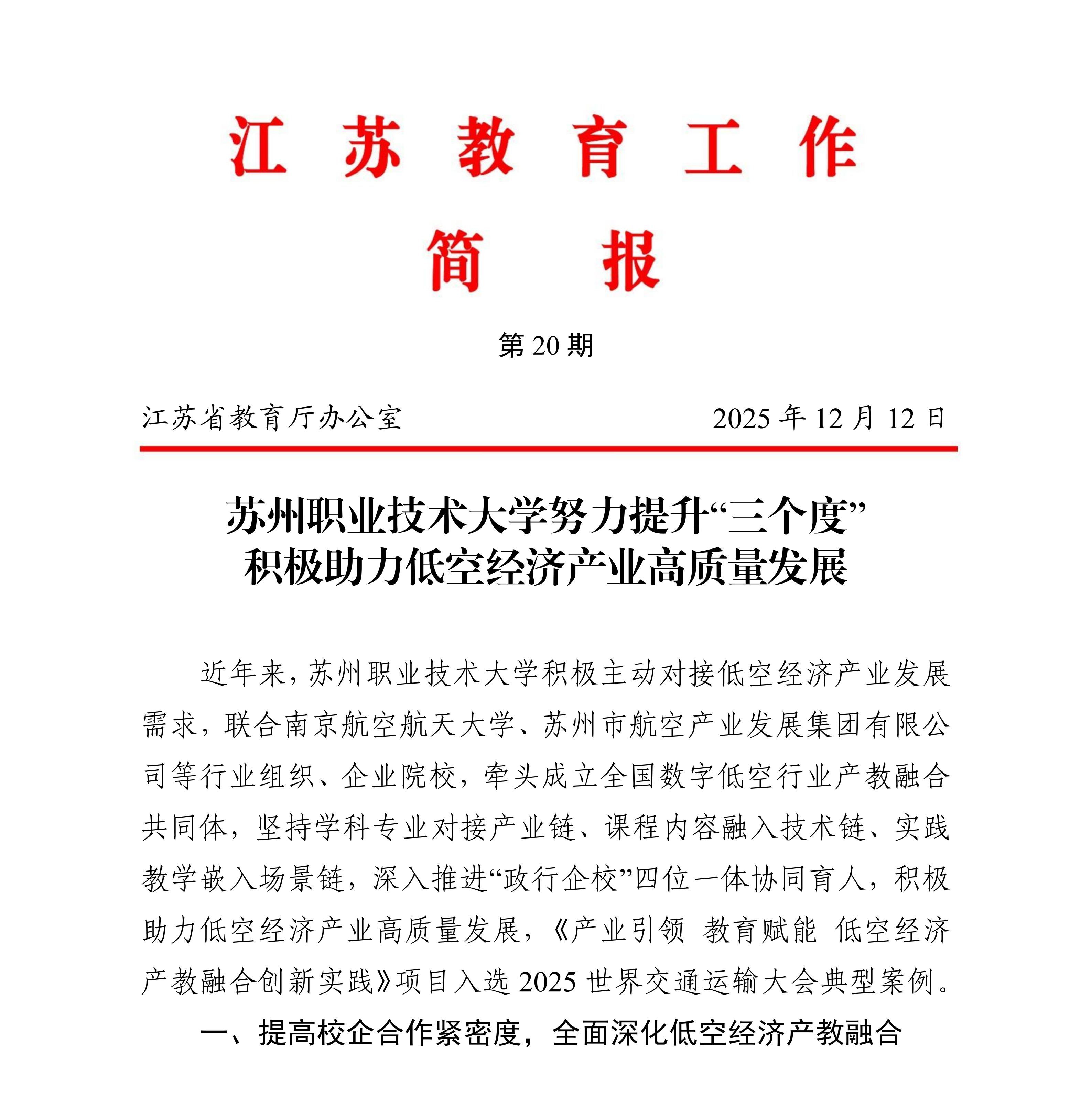 【江苏省教育厅官网】江苏教育工作简报2025年第20期《苏州职业技术大学努力提升“三个度” 积极助力低空经济产业高质量发展》