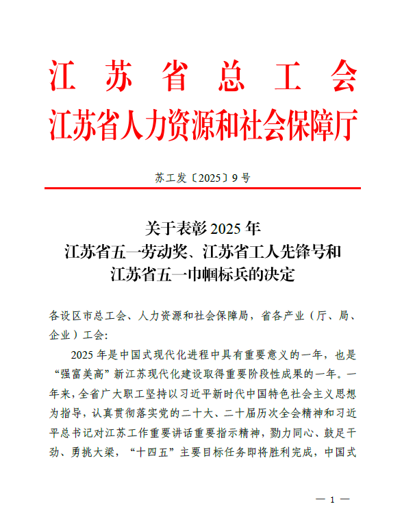我校荣获“江苏省五一劳动奖状”荣誉称号