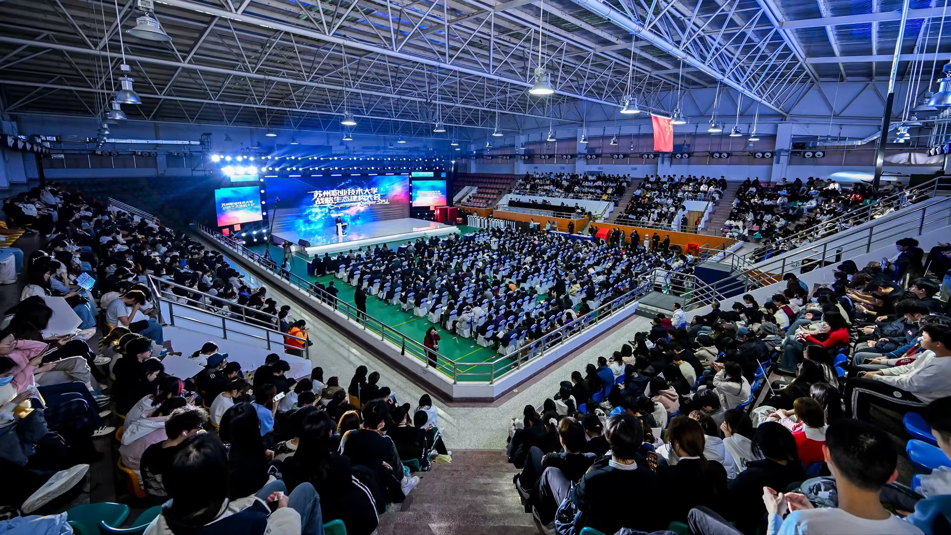 12月24日下午,苏州职业技术大学“Super Share,Super SPU”战略生态建构大会在石湖校区体育馆举行。这是一场聚焦“超级共享”核心理念,凝聚职业教育发展合力,构建校、企、社、地新发展战略生态,推动职业教育高质量赋能城市发展的盛会。教育部职业教育发展中心副主任任占营、工信部人才交流中心副主任曾卫明、省教育厅二级巡视员崔春霞、省工信厅二级巡视员卢载贵、苏州市人民政府副市长刘博,以及同济大学、浙江工业大学嘉宾代表,以及市相关部委办局、各板块领导,合作企业、兄弟院校和各界嘉宾、师生代表共1000余人齐聚一堂,共襄盛会。