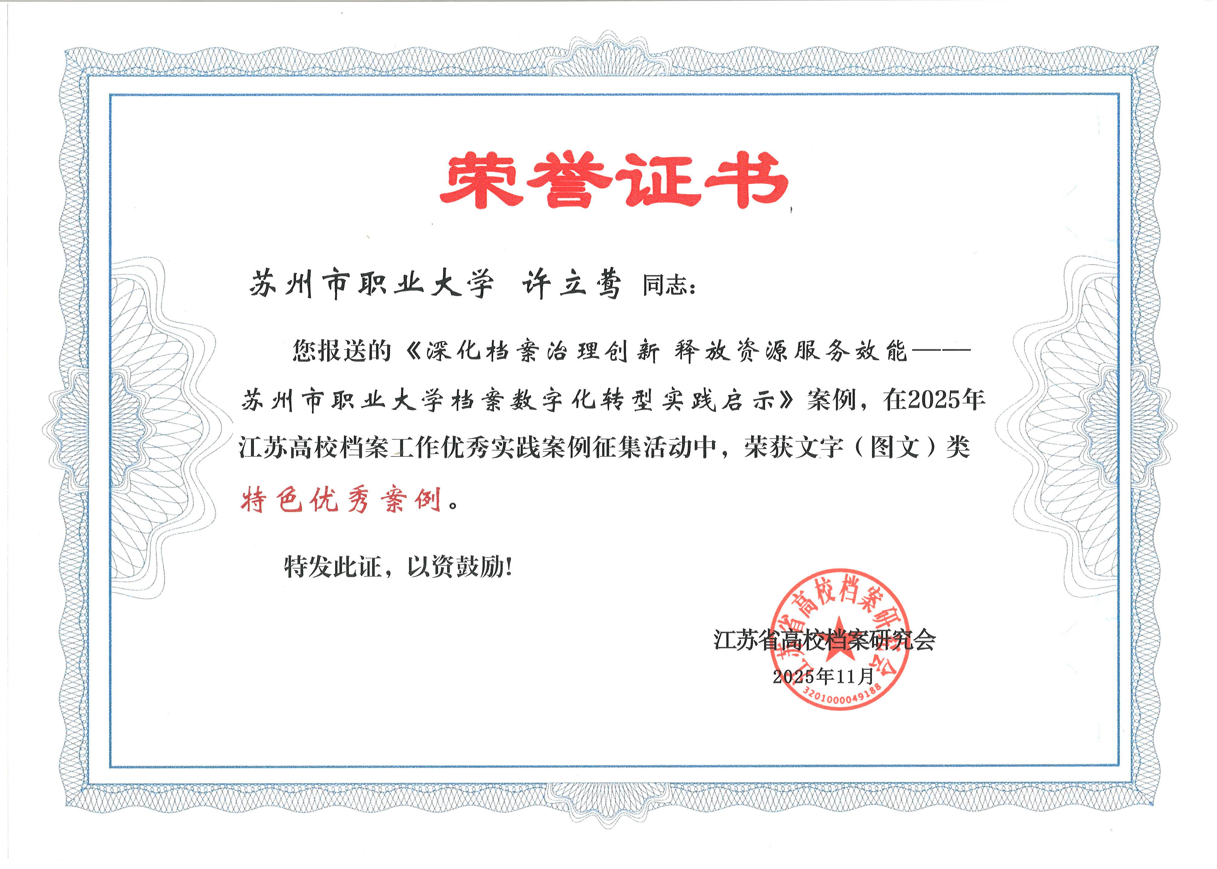 11月17日,江苏省高校档案研究会2025年学术年会暨十一届七次理事会议在常州召开。会上宣布了江苏高校档案工作优秀实践案例评审结果并举行颁奖仪式,学校档案馆副馆长许立莺申报的《深化档案治理 创新释放资源服务效能——苏州市职业大学档案数字化转型实践启示》获评“特色优秀案例”;刘萍申报的《数智时代 服务“不打烊”》获评“优秀案例”。