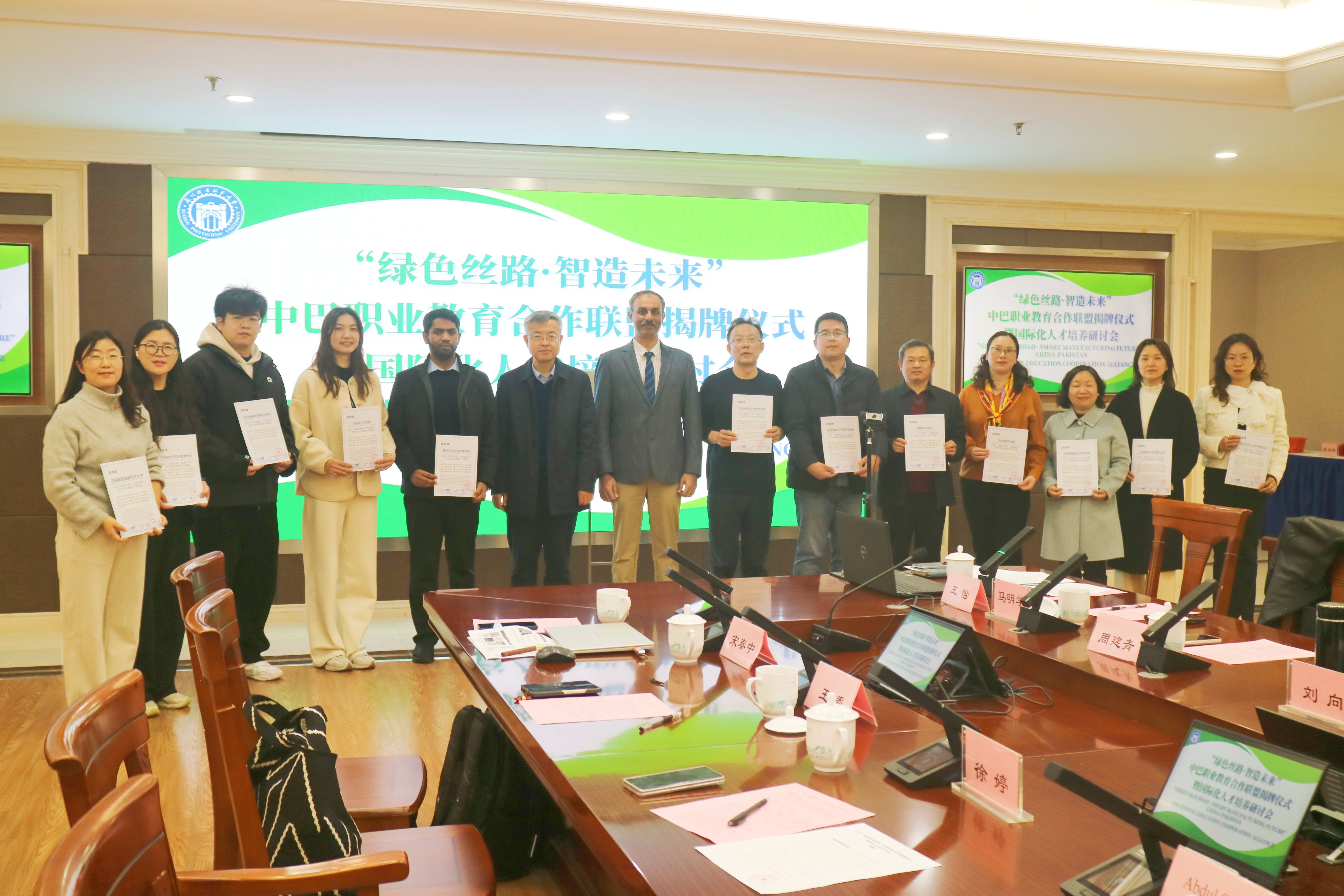 12月17日,“绿色丝路・智造未来”中巴职业教育合作联盟成立仪式暨国际化人才培养研讨活动在惠和楼举行。该联盟由我校与巴基斯坦国家技术大学联合发起,汇聚两国教育机构、行业协会及龙头企业力量,致力于构建“产学研用”一体化的国际化技能人才培养体系,为中巴经济走廊建设提供人才支撑。作为巴方代表,中巴国际产教融合联盟代表埃贾兹・穆罕默德・巴布尔、中巴产教合作卓越中心专家萨塔尔・阿卜杜勒、中巴郑和学院(伊斯兰堡)合作院校巴基斯坦国家技术大学技能学院院长纳迪姆·哈立德受邀出席本次活动。苏州城市学院、苏州经贸职业技术学院等八所中方院校代表,以及上海蔚来汽车有限公司、金龙联合汽车工业(苏州)有限公司等长三角地区新能源与智能制造领域龙头企业代表齐聚现场。我校副校长孙学文及国际合作交流处、机电工程学院、电子信息工程学院、计算机工程学院等相关人员出席会议。