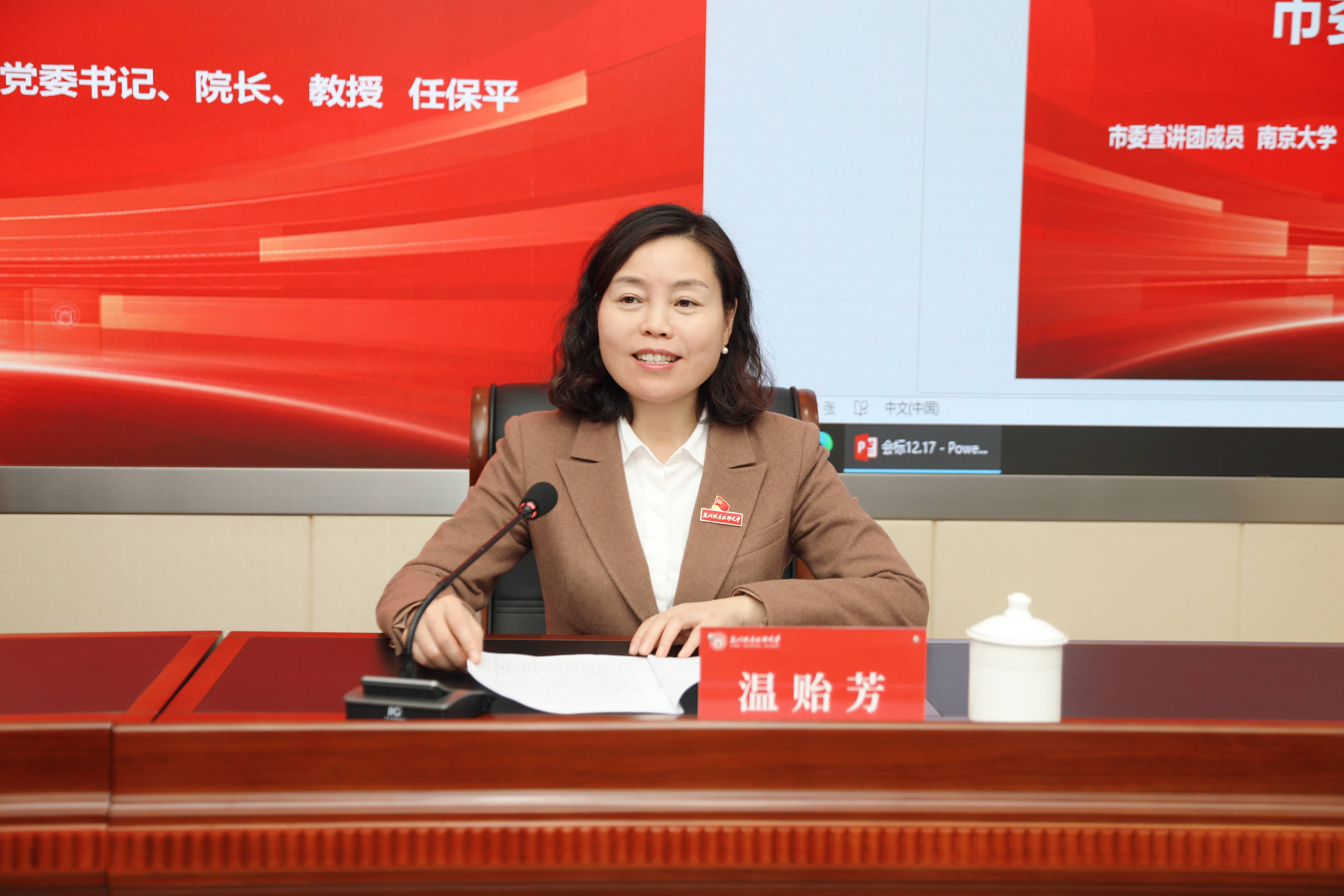 12月22日,我校在惠和楼317会议室举行学习贯彻党的二十届四中全会精神市委宣讲团报告会。市委宣讲团成员、南京大学(苏州)数字经济与管理学院党委书记、院长、教授任保平来校作宣讲报告。校领导、全体中层干部参加报告会。报告会由校党委书记温贻芳主持。