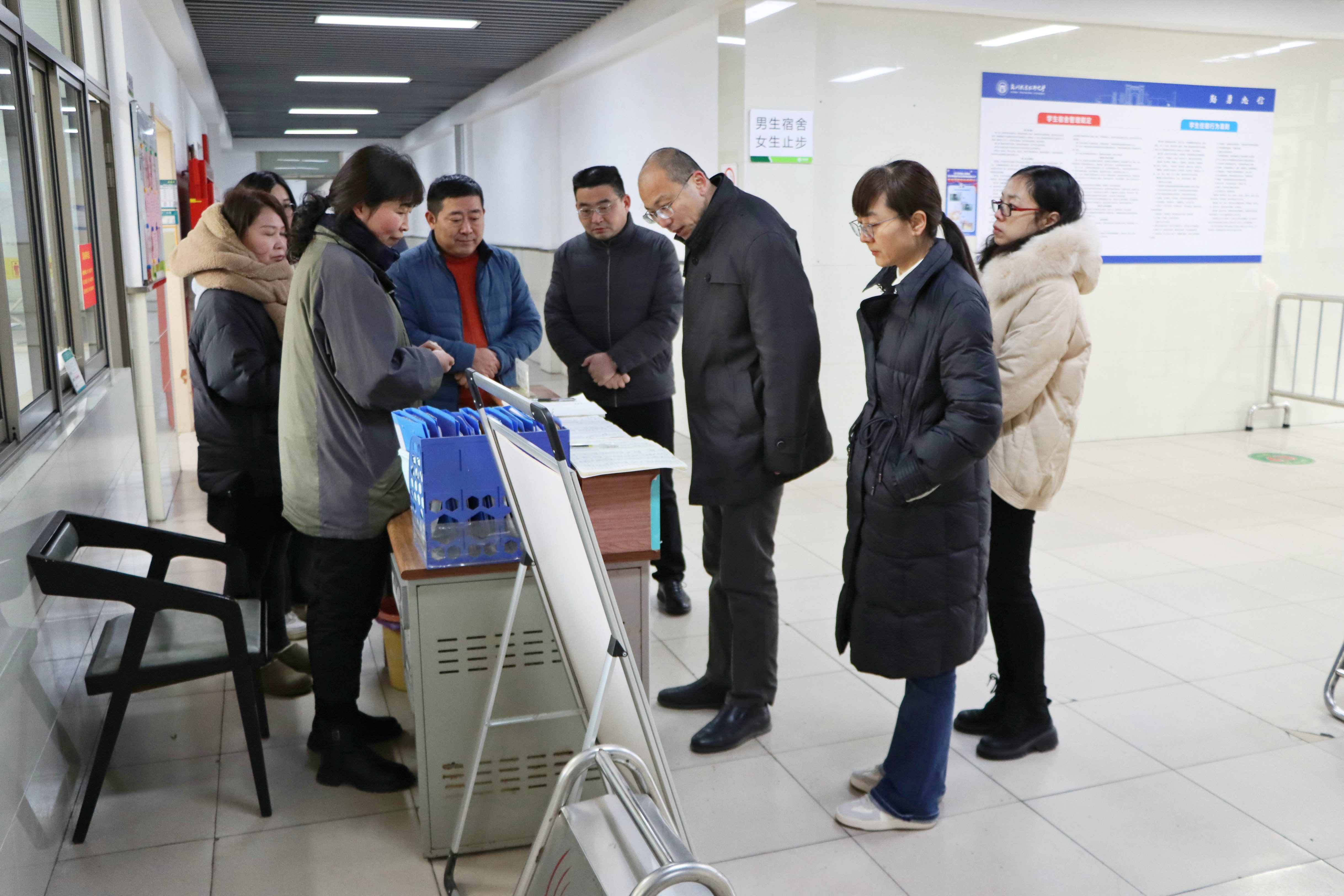 检查组聚焦寒假校园安全工作特点,坚持问题导向,先后深入禹济楼汽车实训车间、学园大厦、4号门改造现场、12号及15号宿舍楼、学园咖啡厅、第三食堂等重点区域,通过实地查看、现场询问、查阅台账等方式,开展全方位、无死角的安全排查。在汽车实训车间,重点检查了设备存放管理、充电设施安全及应急防护措施落实情况;在学园大厦,详细核查了消火栓压力、电梯运行维保及消防通道畅通等情况;针对4号门改造现场,着重强调了施工收尾阶段的安全管控和现场防护要求;走进学生宿舍,细致检查了卫生文明管理、用电安全、违禁物品存放等情况,叮嘱相关负责人做好假期留校学生安全保障工作;在咖啡厅和第三食堂,重点排查了食品采购验收、储存加工、餐具消毒等食品卫生安全环节,以及灶台油烟清洁、燃气使用、消防设施配备等消防安全隐患。