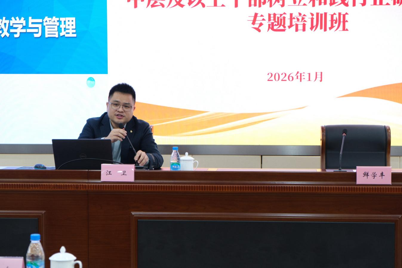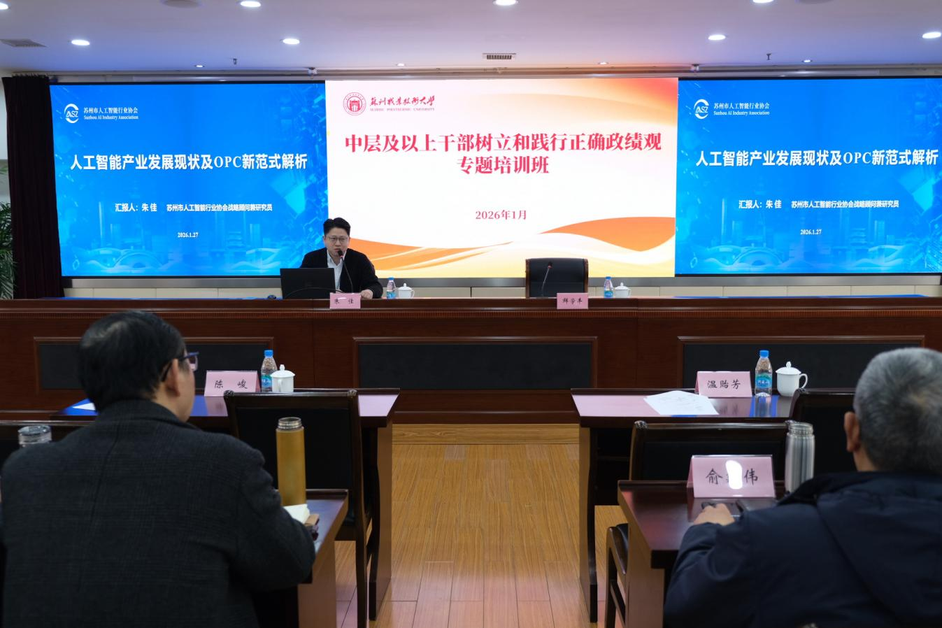 1月27日,培训聚焦发展前沿与改革实践。电子信息工程学院、机电工程学院负责人分别就现场工程师培养、深化产教融合等工作作专题分享。苏州市人工智能行业协会专家解读了人工智能产业发展现状与OPC新范式。科大讯飞专家现场演示了AI技术在教育领域的创新应用。江苏省教育厅原副厅长、一级巡视员袁靖宇同志应邀作专题辅导,系统阐述教育强国建设中高校的使命,强调学科专业应转向产业需求导向,为干部树立正确政绩观提供方向指引。袁靖宇寄语我校,应立足更高格局谋划未来发展,在教育、科技与产业深度融合的新时代中精准定位,为干部树立和践行正确政绩观提供了清晰的方向指引。