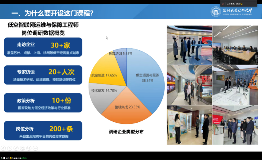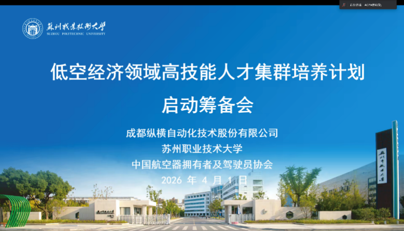 4月1日,低空经济高技能人才集群培养计划启动筹备会以线上形式顺利举行。本次会议由成都纵横自动化技术股份有限公司、苏州职业技术大学、中国航空器拥有者及驾驶员协会(简称“中国AOPA”)三方共同牵头组织。苏州职业技术大学校长陈峻、成都纵横教育学院无人机学院副院长许开冲、中国AOPA低空产业研究部副主任郭红俊,以及来自全国11所“双高计划”建设院校的40余位专家和教师参加会议。会议由数字低空学院院长邓建平主持。
