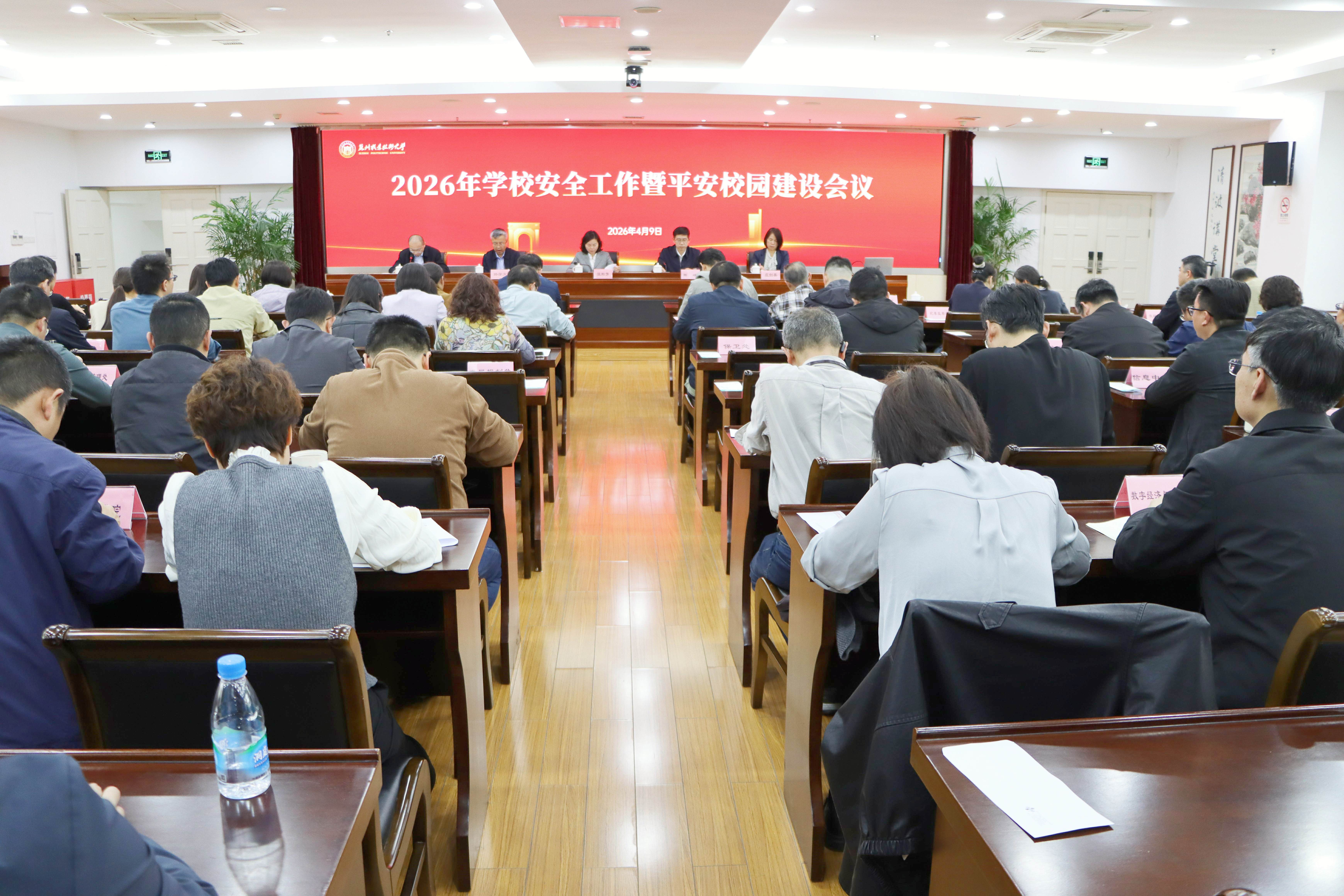 为深入学习贯彻总体国家安全观,全面部署2026年学校安全工作,持续推进高质量平安校园建设,切实筑牢校园安全防线,4月9日下午,学校召开2026年安全工作暨平安校园建设工作会议。校党委书记温贻芳,党委副书记、校长陈峻,党委委员、副校长孙学文,党委委员、纪委书记庄剑英及全体中层干部出席会议。会议由党委委员、副校长张军主持。