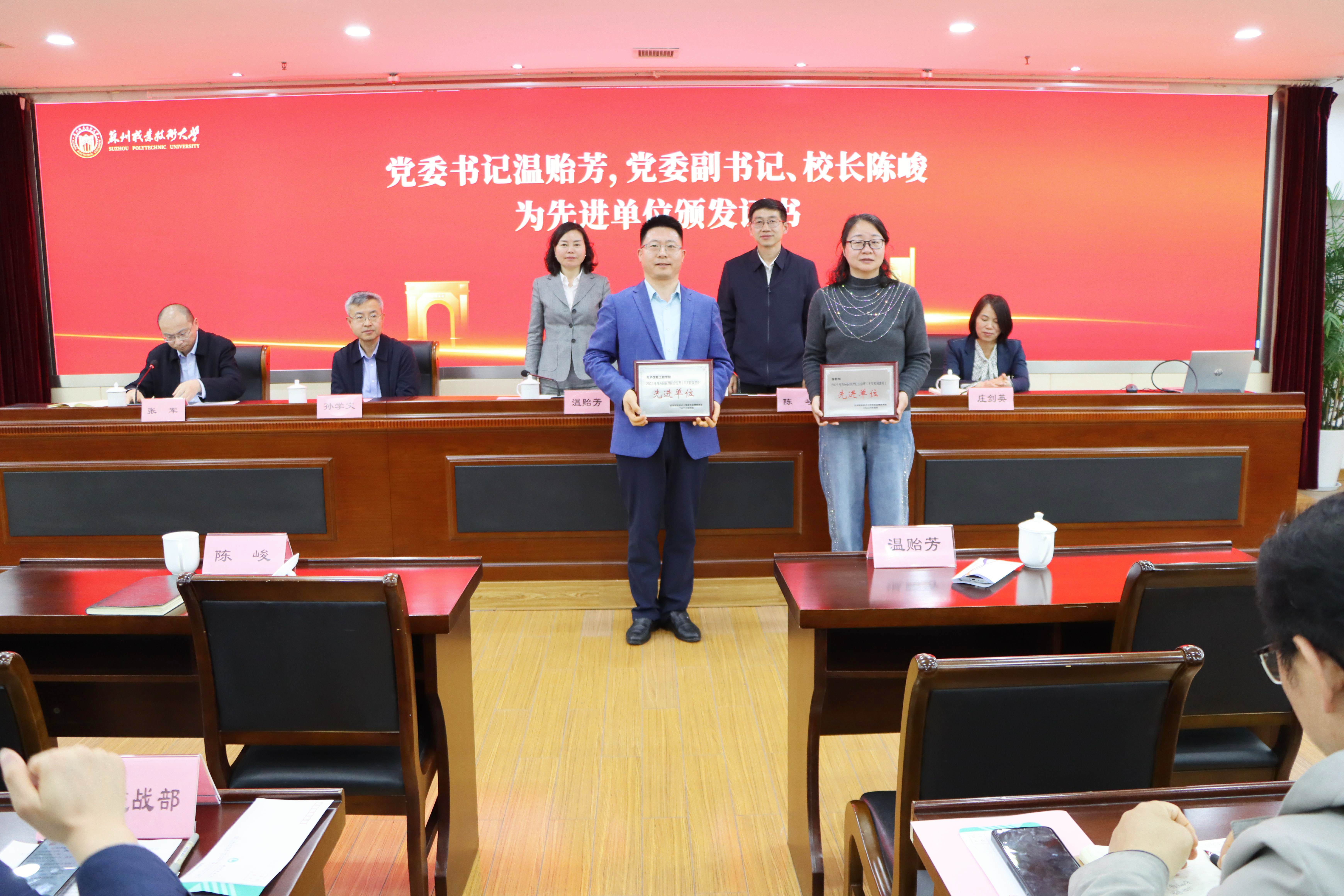 会上,全体与会人员集体观看了总体国家安全观警示教育片,进一步深化对总体国家安全观的理解,强化国家安全意识。张军宣读了《关于表彰2025年度校园管理综合治理暨平安校园建设先进单位的决定》,电子信息工程学院、体育部荣获“先进单位”称号。温贻芳、陈峻为获奖单位颁发荣誉证书,激励各单位切实履行安全管理责任。