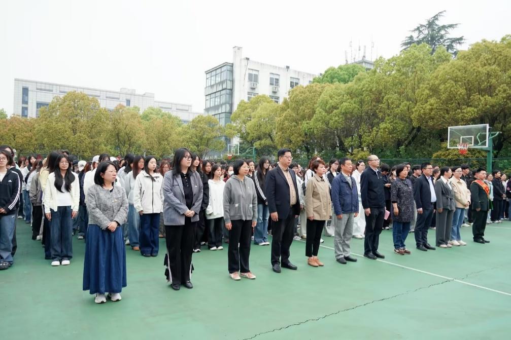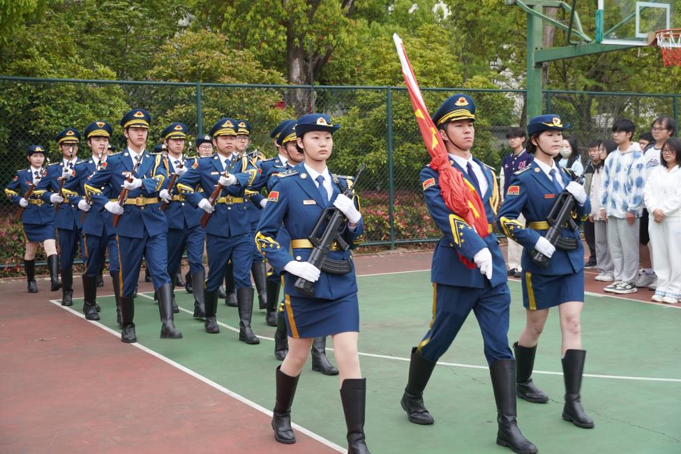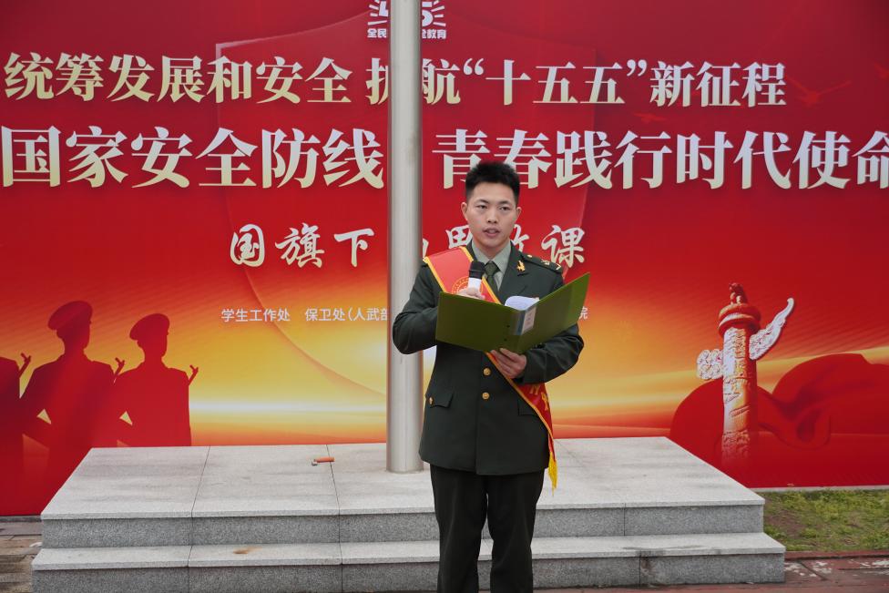 清晨的干将路校区操场庄严肃穆。校国旗护卫队护送五星红旗入场,全体师生高唱国歌,向冉冉升起的国旗行注目礼。优秀退役士兵代表韦天擎同学结合军旅经历作国家安全主题宣讲,号召同学们从日常做起、从小事做起,自觉守护国家利益与校园安全。