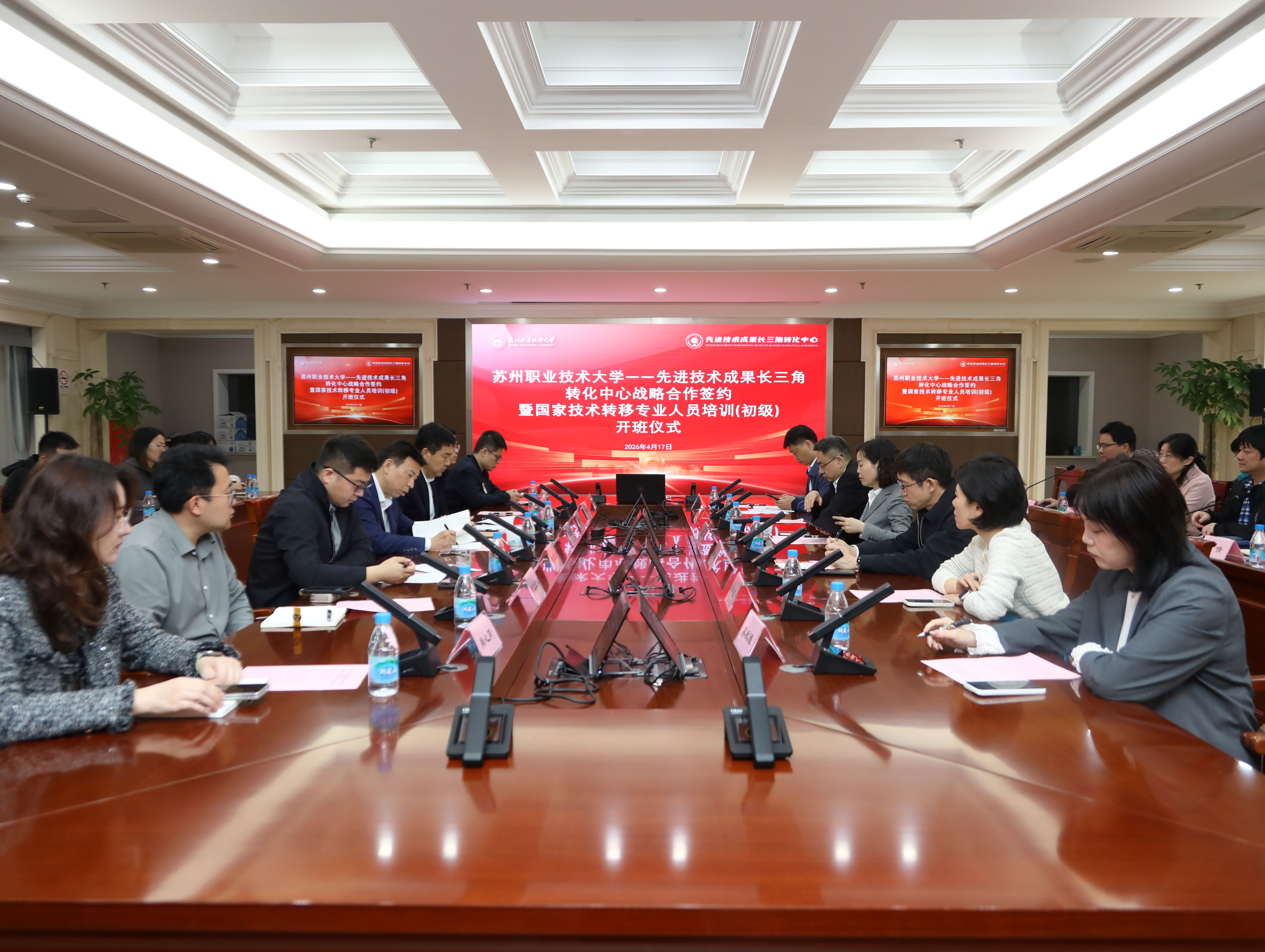 4月17日上午,我校与先进技术成果长三角转化中心战略合作签约暨技术经理人培训开班仪式在惠和楼举行。省工信厅二级巡视员、省国防科工办副主任卢载贵,先进技术成果长三角转化中心主任张杰、综合党群部副部长张良山、转化一部副部长应春卫、转化二部副部长陈宝玉、转化三部副部长田昊,市科技服务中心主任汤宁、吴中区科技局副局长向兢,新华社中国经济信息社江苏中心区域经济部主任肖心月,市生产力促进中心科技成果转化部项目主管吴秋雁,以及我校党委书记温贻芳、校长陈峻、副校长王峰和相关职能部门负责人共同出席活动。仪式由王峰主持。