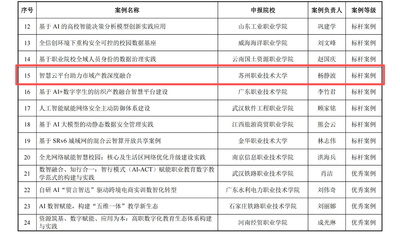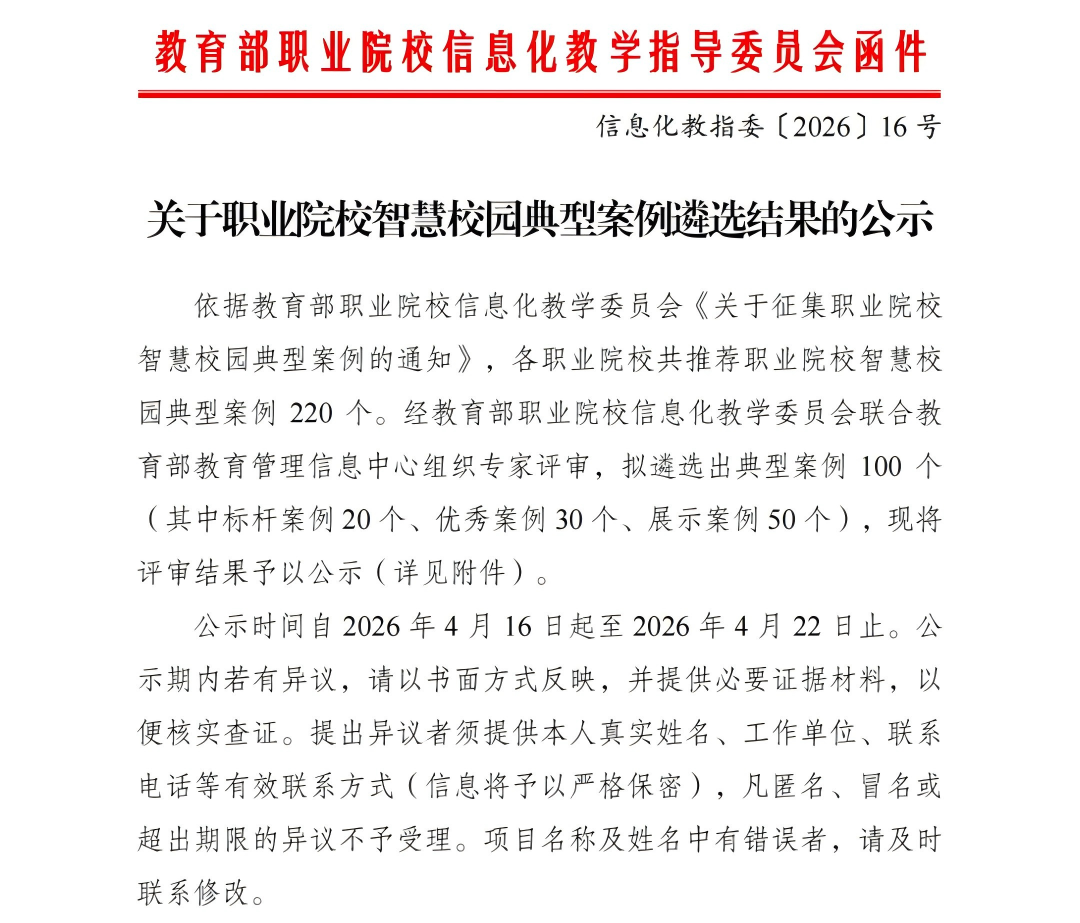近日,教育部职业院校信息化教学指导委员会公布2026年职业院校智慧校园典型案例评选结果,我校申报的《智慧云平台助力市域产教深度融合》成功入选,获评2026年全国职业院校智慧校园标杆案例。