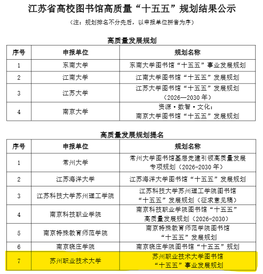 此次入围省级高质量规划,标志着学校图书馆的顶层设计能力与战略谋划水平迈上了新台阶,也是学校持续推进国家第二期“双高计划”建设、深化职业本科教育改革的又一成果体现。该规划对职业院校图书馆的内涵发展与智慧转型具有重要的参考价值。图书馆将以此次获奖为契机,扎实推进规划落地实施,努力打造具有职业本科特色与吴地文化底蕴的现代图书馆服务体系,为学校事业高质量发展提供更为坚实的文献信息与知识服务支撑。